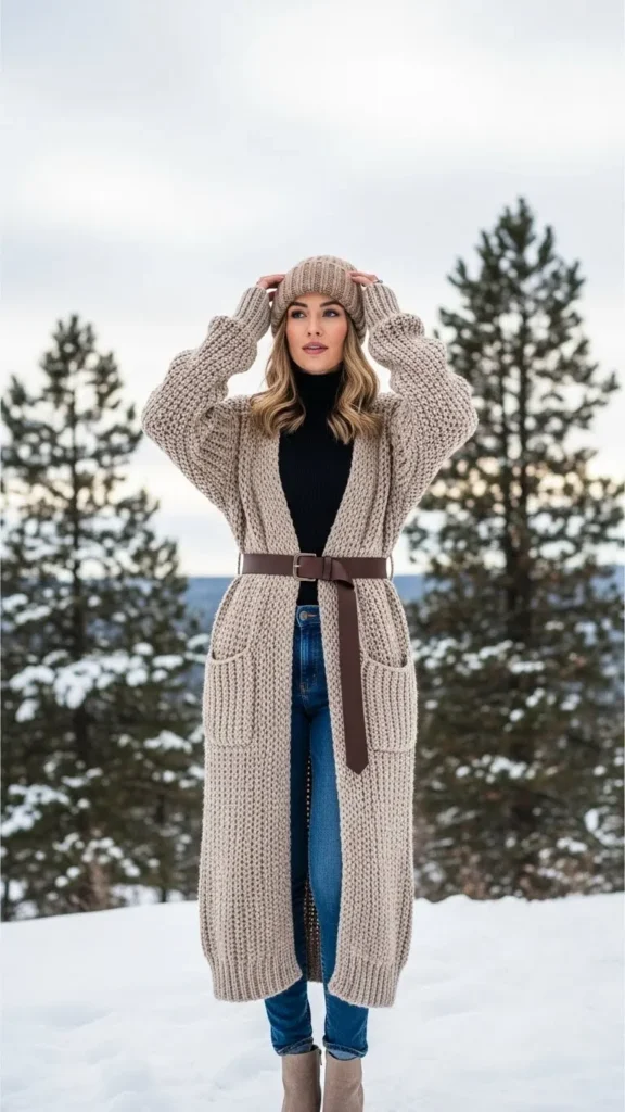 Add a belt over a long cardigan. This creates shape. Pair with leggings or jeans. Budget tip: use any simple belt you own. This outfit feels cozy and styled.