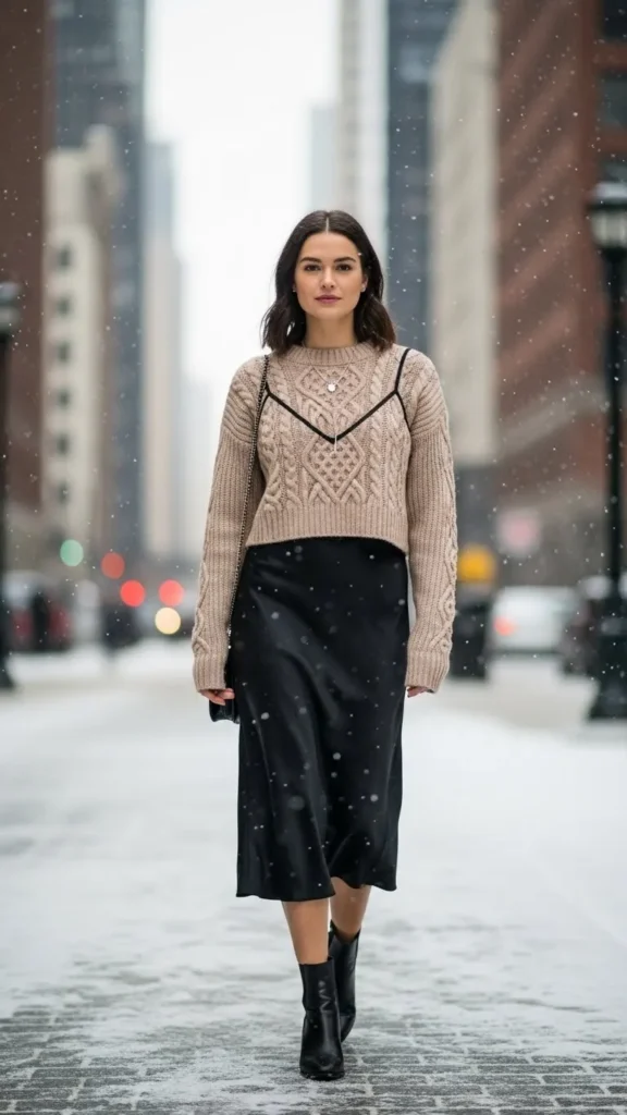 Layer a sweater over a slip dress. Let the hem show. Add boots and tights. This trick extends summer dresses into winter.