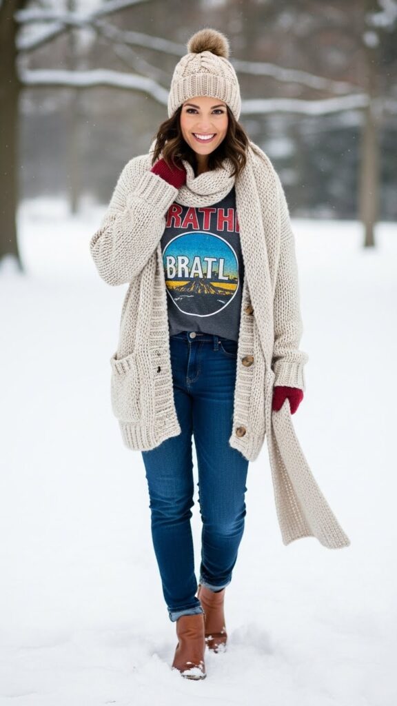 A cardigan softens a casual tee. Choose a longer cardigan for warmth. Pair with straight jeans or leggings. This outfit feels relaxed but styled. Budget tip: sew on new buttons to update an old cardigan. Roll sleeves for ease. Wear sneakers or ankle boots. This look works for school days or hanging out.
