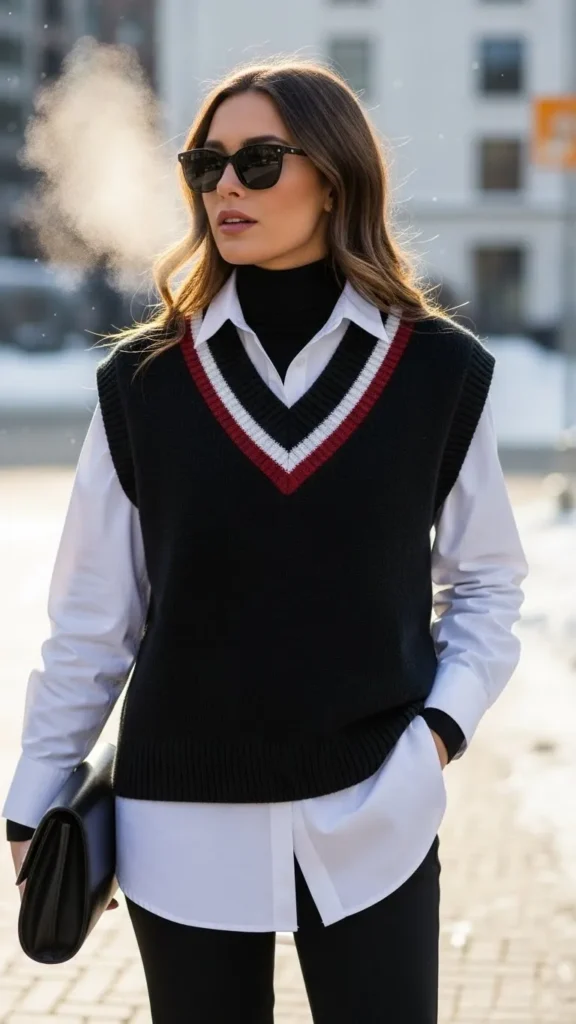 Layer a sweater vest over a button-up shirt. This adds warmth without bulk. Choose neutral shades. Pair with jeans or trousers. Thrift stores often carry sweater vests. Size up for layering ease. This outfit works well for school or casual events.