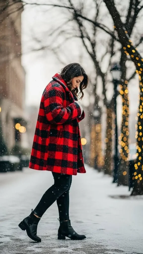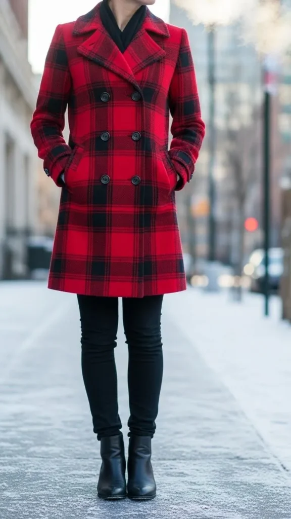 A bright red plaid coat is a winter staple you’ll wear over and over. Pair it with black skinny jeans to balance the loud print. Black shoes keep the focus on the coat but feel free to choose boots with a subtle heel for a bit of polish. To save money, check thrift stores for quality plaid coats or swap with friends. This combo works for errands, coffee runs, or casual office days.