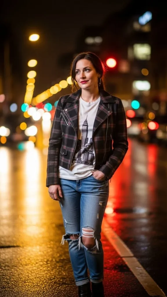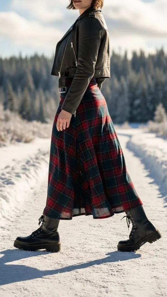 Mix edgy and classic with a plaid biker jacket layered over a casual graphic tee. This outfit works well for milder winter days. Look for sales or upcycle old jackets with sewn-in plaid panels. It’s a budget hack that adds visual interest and warmth in one piece.