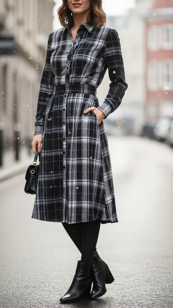 Plaid button-down dresses feel fresh in winter paired with tights and boots. Choose wool blends or heavier cotton fabric versions to stay warm. Layer under long cardigans or simple coats. To save, look for cuts on sale or in secondhand shops. This is a stylish day-to-night shift with minimal fuss.