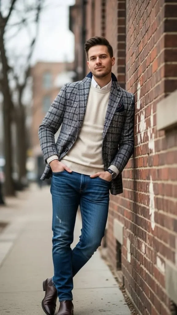 Plaid blazers create a smart-casual look for the cold season. Layer over warm crewneck sweaters and pair with jeans or trousers. Affordable blazers often appear during holiday sales or at consignment stores. Add simple accessories like scarves or beanies to finish the ensemble. This outfit works for casual workdays or dinner plans. Plaid is an excellent way to add personality and cozy vibes to your winter wardrobe.