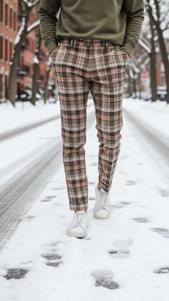 Plaid pants can be casual when paired with a plain solid sweatshirt. Opt for softer fabrics and relaxed fits for comfort. Avoid busy patterns in your top to keep plaid front and center. Try DIY by sewing simple elastic waistbands on thrifted pants for an easy update. Sneakers finish this everyday, relaxed vibe.