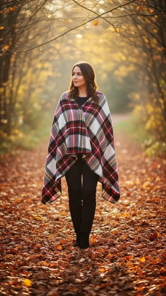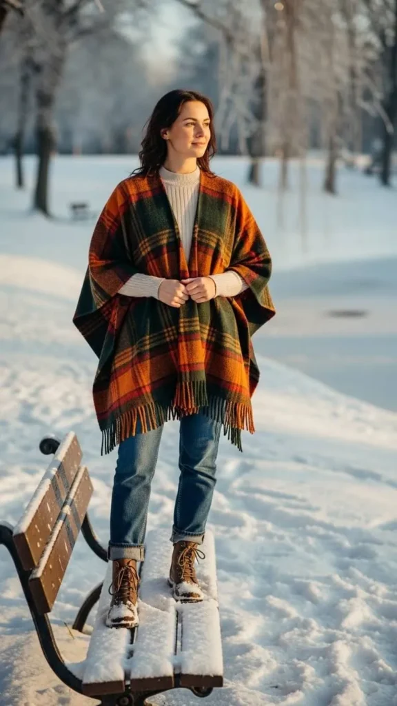 Use a plaid blanket cape for easy style and warmth. Wear it over fitted leggings and boots for a balanced silhouette. You can DIY a cape by sizing up an old blanket and adding fabric ties or fringe. This look adds instant flair while being cozy. It’s great for leisurely winter strolls.