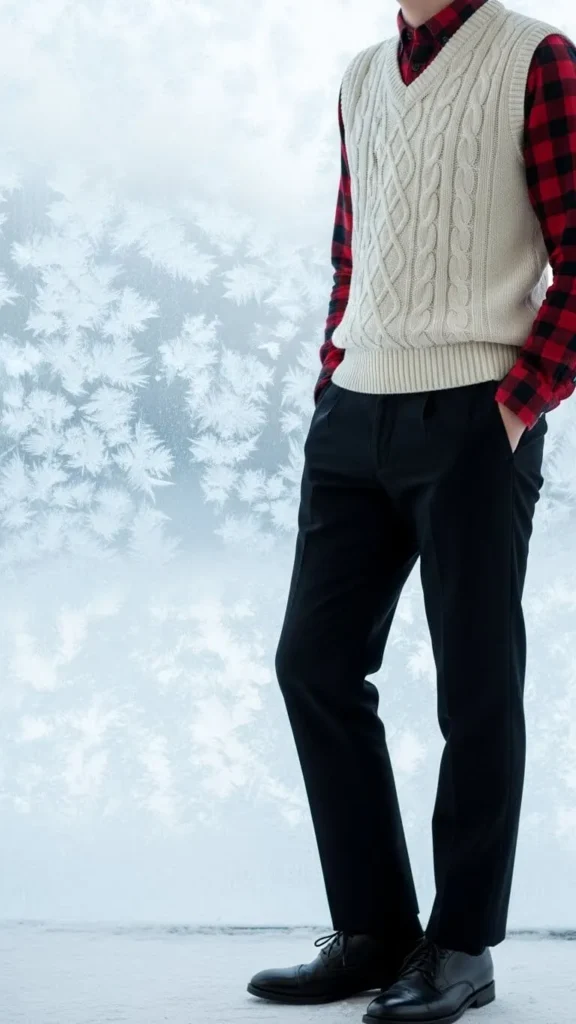 Layer a plaid shirt under a sweater vest to add texture and a hint of casual style. The shirt collar peeks out, showing pattern without making the outfit busy. Sweater vests are often discounted in winter sales. You can also modify an old sleeveless sweater by cutting and stitching. This layering keeps you warm without bulk.