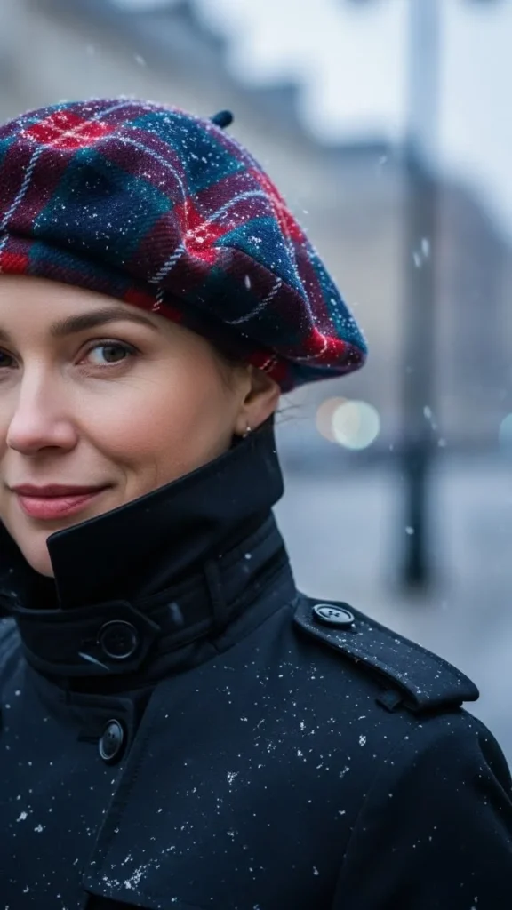 9. Plaid Wool Beret with Dark Trench Coat
