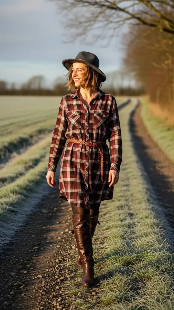 A shirt dress in plaid can be layered with cozy tights or leggings. Adding a belt helps define your waist and polish the silhouette. Use secondhand leather belts or fabric sashes from your closet to avoid spending much. This casual yet put-together outfit is easy to wear on errands and meetups.