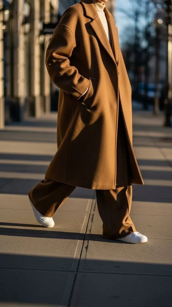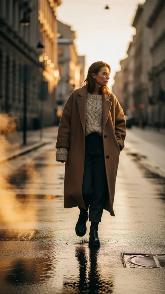An oversized coat always works. It gives room for layers underneath and makes even simple outfits feel put-together. Pair it with wide-leg trousers for a relaxed shape that moves well. Go for neutral shades like tan, grey, or charcoal, so the outfit stays easy to repeat. If you’re on a budget, check thrift shops for wool coats. They often have great structure and age beautifully. Add a plain knit top or a thin hoodie inside for warmth. Use sneakers if you want a casual feel, or swap them for ankle boots when you want something sharper. Keep accessories light—maybe a tote bag or a simple scarf. This look works for daily winter walks, office runs, or weekend coffee breaks.
