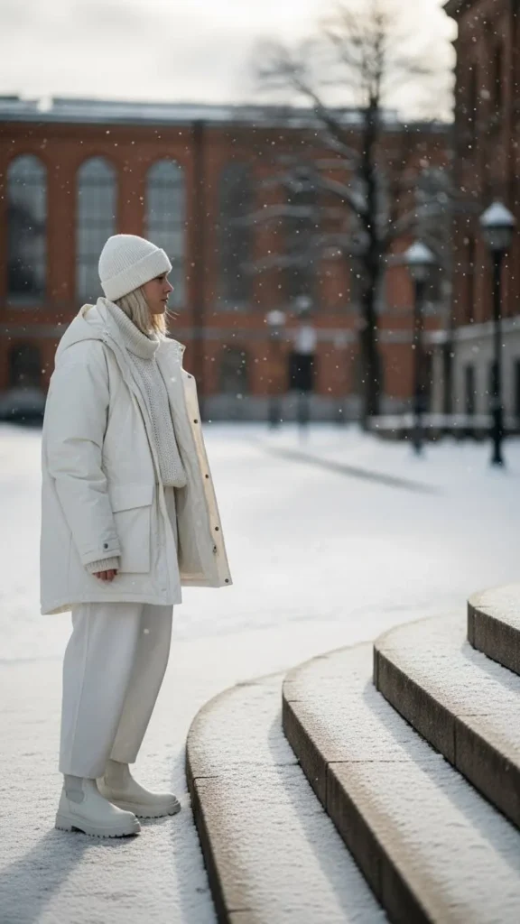 An all-white outfit feels clean and stylish. Mix different shades like cream, ivory, and off-white. Use pieces you already own: a white sweater, light jeans, a cream coat. Add beige or tan boots to warm up the look. You don’t need new items—just style lighter pieces together. This look works well for outings, photos, or everyday winter moments.