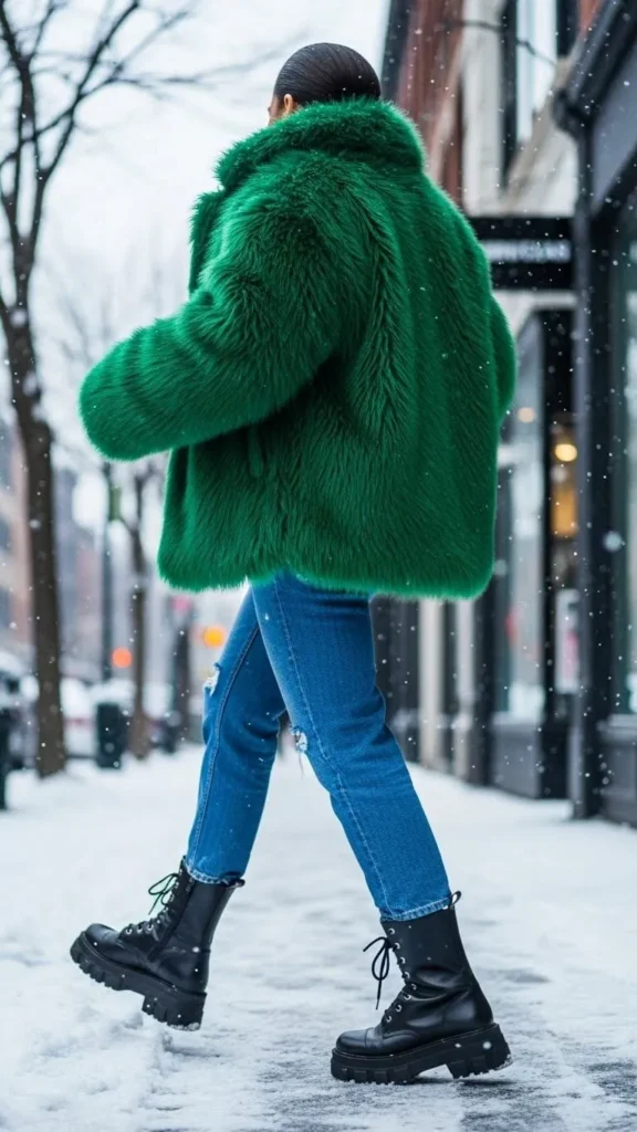 A faux fur coat adds texture and fun to winter outfits. Neutral colours like cream, brown, or black keep it wearable. Pair with straight denim for balance. Vintage shops often carry budget-friendly faux fur pieces. Add boots to anchor the look. Keep the inner top simple with a basic knit or tee. This style works well for dinners, outings, or everyday errands.