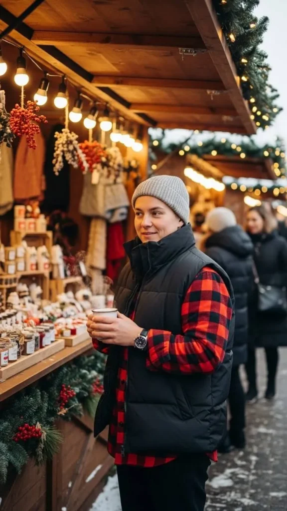 A flannel shirt adds pattern and warmth. Layer it under a puffer vest to keep your core warm. Pair with jeans or joggers. Deep colours like red, green, and navy work well in winter. Thrifted flannels are usually cheap and soft. Add boots or sneakers depending on your day. This look suits winter markets, walks, and casual routines.