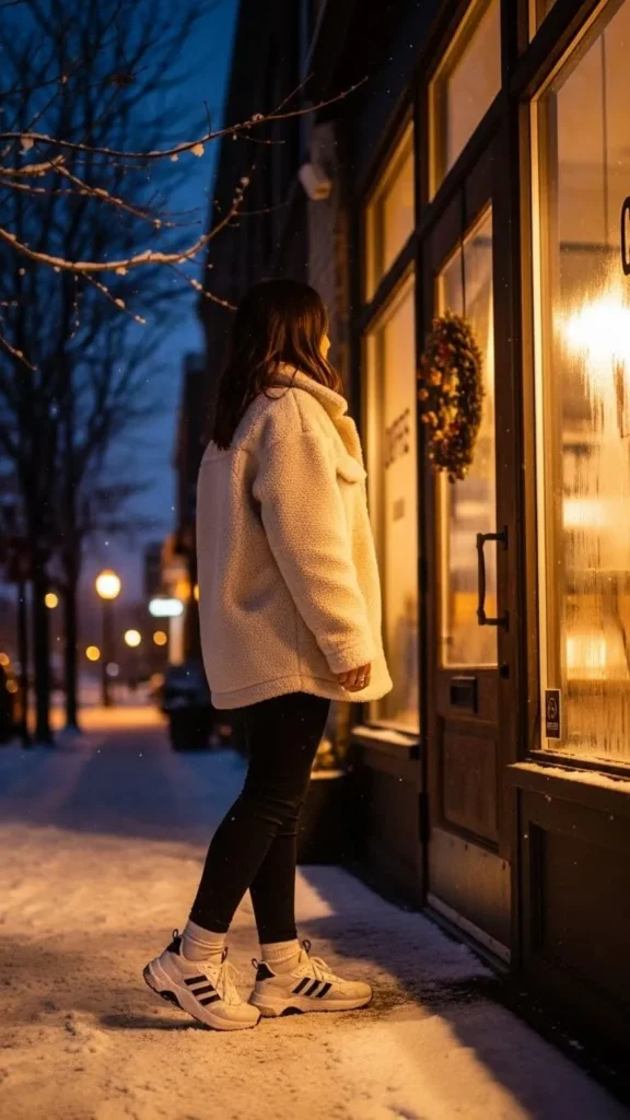 A sherpa jacket feels soft and warm. It pairs easily with black leggings for a relaxed winter look. Add long socks and chunky sneakers. Fleece jackets from hiking brands also work as budget options. Wear a fitted tee or turtleneck underneath. Add a crossbody bag or mini backpack. This outfit works for casual walks or slow weekends.
