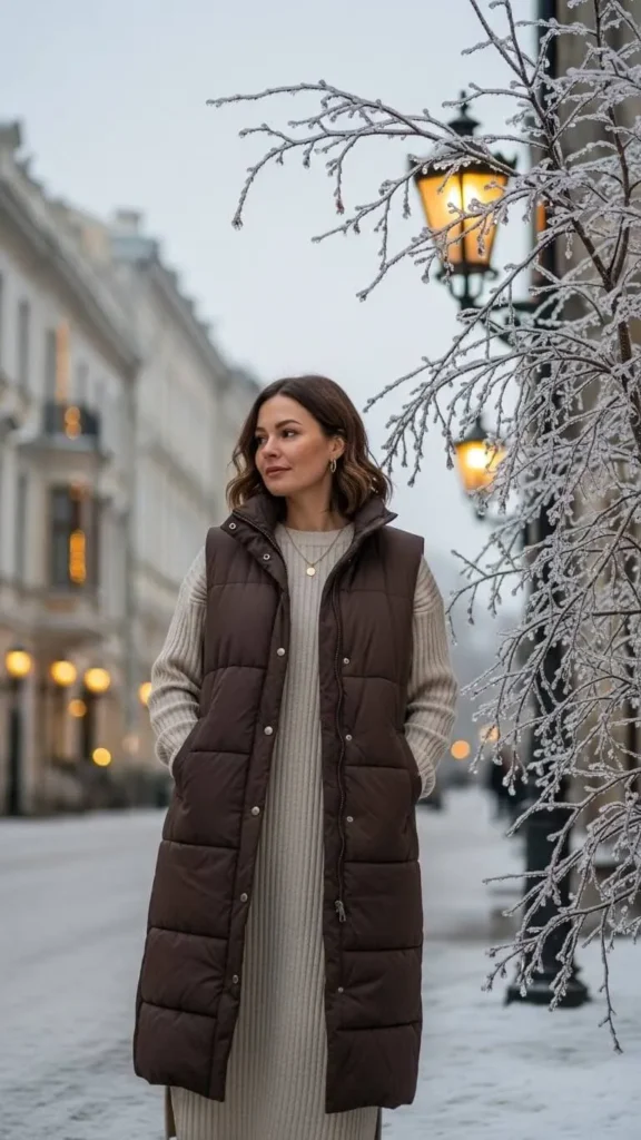 A long puffer vest makes a knit dress practical for winter. Choose a vest that falls around the knees for warmth. A ribbed knit dress adds stretch and comfort. If you want to save money, many budget brands offer ribbed dresses that last several seasons. Wear ankle boots or tall boots depending on how warm you need to be. Add a scarf or beanie for texture. This outfit is simple but looks thoughtful.