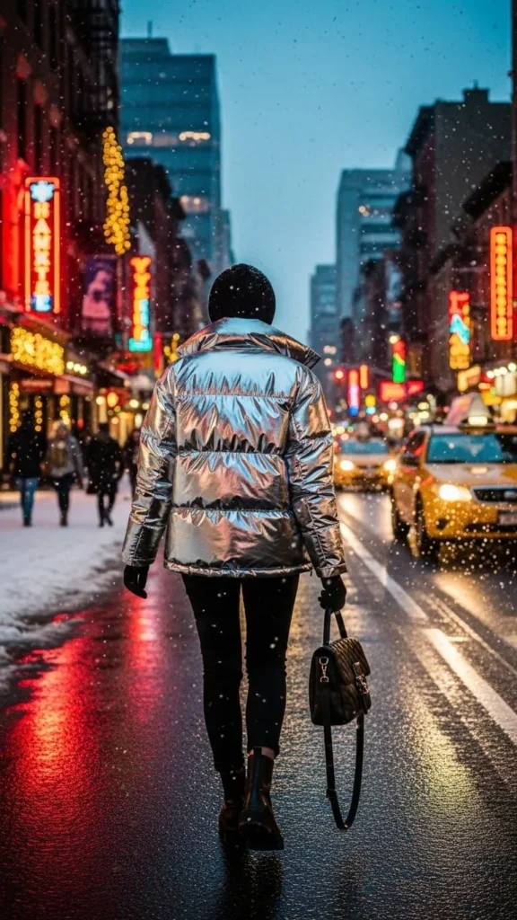 A metallic puffer adds personality without trying hard. Wear it over an all-black base—black jeans, black knit, black boots. The contrast makes the jacket stand out without feeling loud. You can often find metallic jackets on seasonal clearance racks. Add a small black bag to keep the outfit tidy. This is a great look for evenings out.