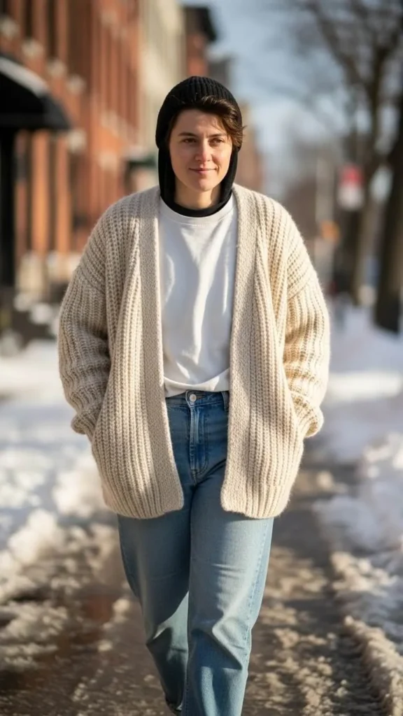 This look feels soft and relaxed. Use an oversized cardigan in wool or thick cotton. Wear it over a basic tee. Add a thermal underlayer if it’s very cold. Pair with relaxed jeans, joggers, or leggings. Oversized cardigans are easy to thrift. Add sneakers or soft boots. This outfit suits slow mornings, casual errands, or cosy work-from-home days.