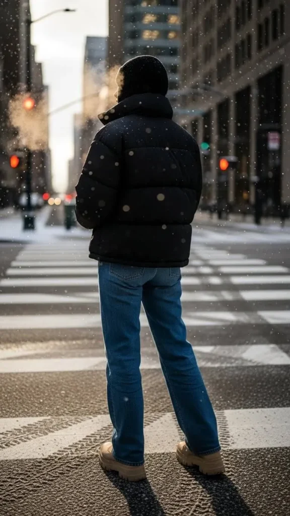 A puffer jacket is a winter staple that doesn’t need to feel bulky. Pick one with clean lines and a matte finish. Wear it with straight-leg jeans for a balanced shape. Dark-wash jeans look sharper, while mid-wash keeps it casual. If money is tight, search online marketplaces for last year’s puffer drops; many people sell lightly worn pieces. Layer a simple crewneck or turtleneck underneath to keep the outfit grounded. Chunky boots or thick-sole sneakers work well on wet streets. Add a knitted beanie for comfort. This outfit is warm, simple, and easy to wear every day.
