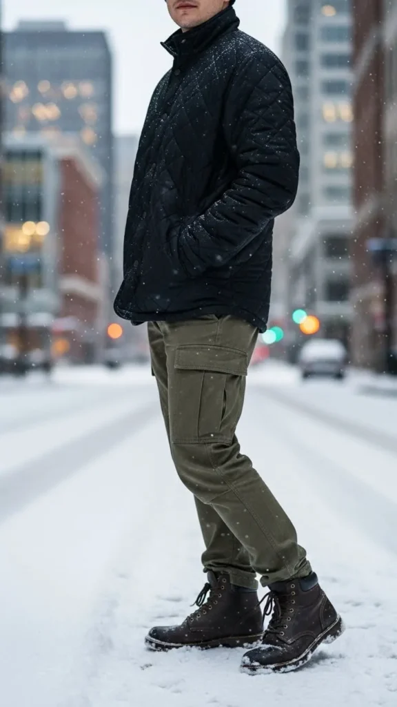 A quilted jacket gives warmth without bulk. It pairs well with cargo pants for a relaxed feel. Pockets add interest without making the outfit busy. Pick earth tones like olive, tan, or deep brown. Wear a simple tee or thin knit underneath. Quilted jackets also show up often in surplus shops at low prices. Add boots with grip for icy sidewalks. This outfit is practical and comfortable.
