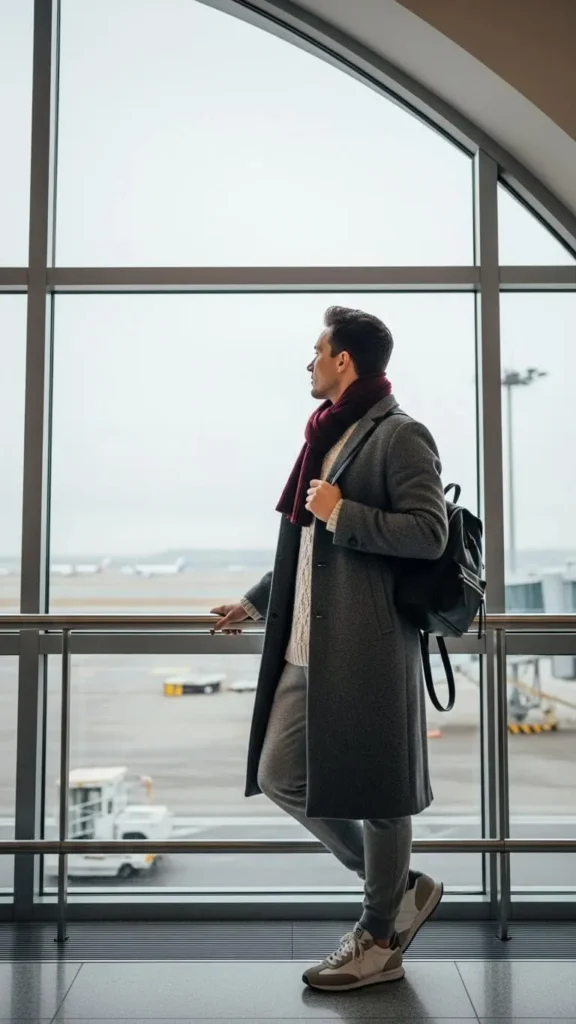 A trench coat works surprisingly well for winter travel when layered properly. Wear a thermal base, a chunky jumper, and a scarf under your trench to stay warm. Pick a trench made from heavier cotton or wool blend. If you’re on a budget, use a hoodie instead of a jumper for warm layering. Trainers or ankle boots finish the look. This style suits airports, shopping streets, and mild winter days.