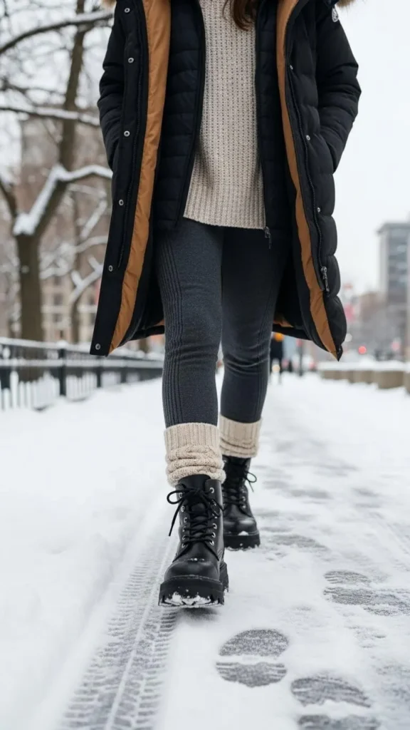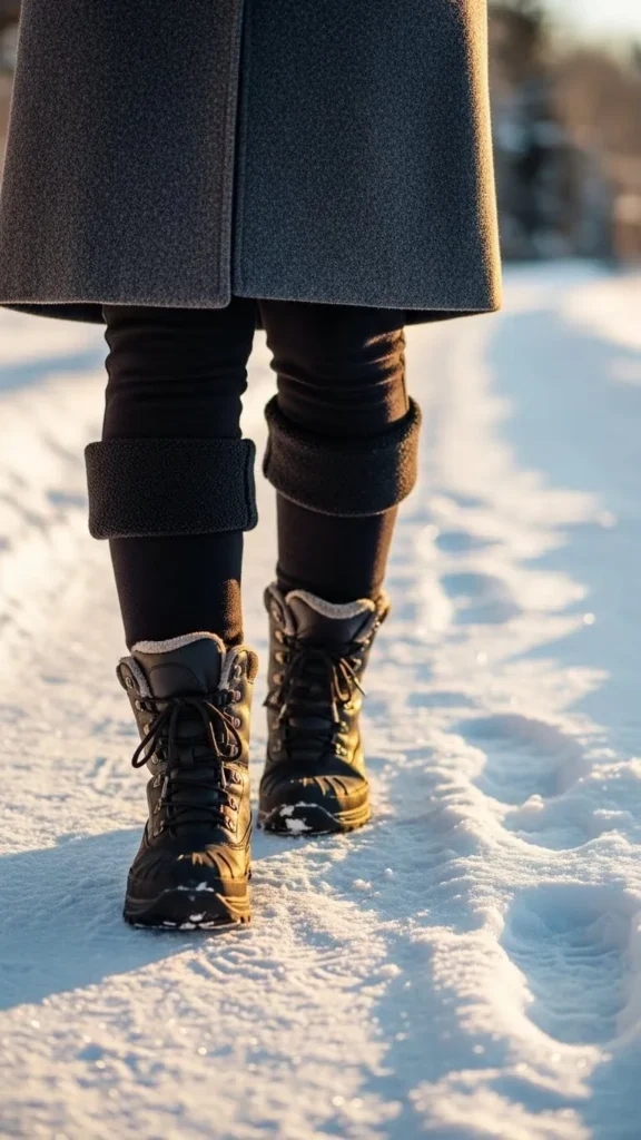 Chunky boots keep your feet warm and stable on icy paths. Wear them with leggings, a knit top, and a warm coat. Add thick socks for extra insulation. If you need a cheaper option, buy insulated insoles for boots you already own. This outfit works for winter markets, long walks, and all-day travel plans.