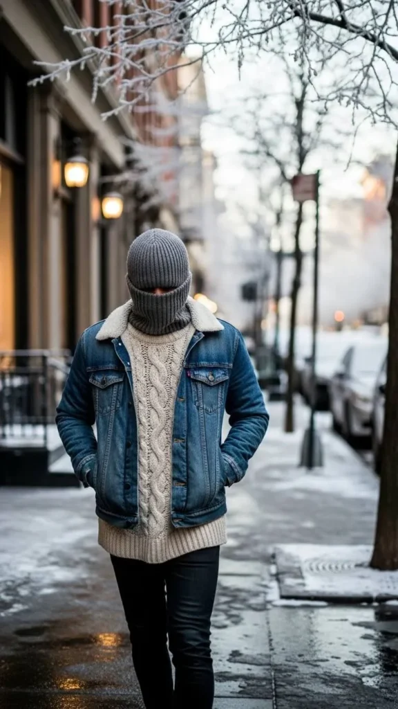 A denim jacket can work even in winter if layered properly. Wear thick knits and a thermal underneath. Add a scarf and warm hat. If you’re saving money, choose an oversized denim jacket so you can layer more underneath. This outfit suits mild climates.