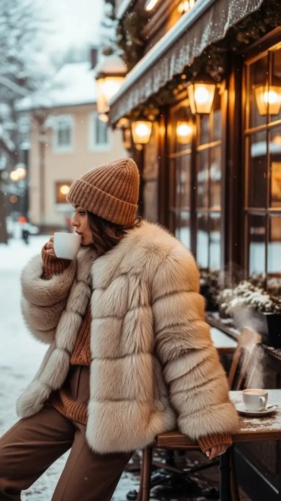 A faux fur jacket adds warmth and style without extra effort. Pair it with simple jeans or leggings. Add a turtleneck for extra heat. If you’re saving money, check secondhand shops—they often carry great faux fur pieces. Keep accessories simple to let the jacket stand out. This outfit works well for nights out or city sightseeing.