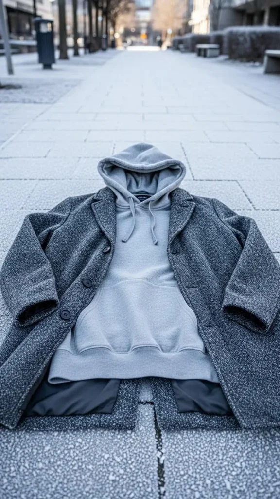 Layering a hoodie under a wool coat gives warmth with a casual touch. Wear leggings or straight-leg trousers underneath. Add trainers or boots depending on weather. If you’re trying to save, reuse your everyday hoodie and pair it with a coat you already own. This outfit works for airports and city exploring.