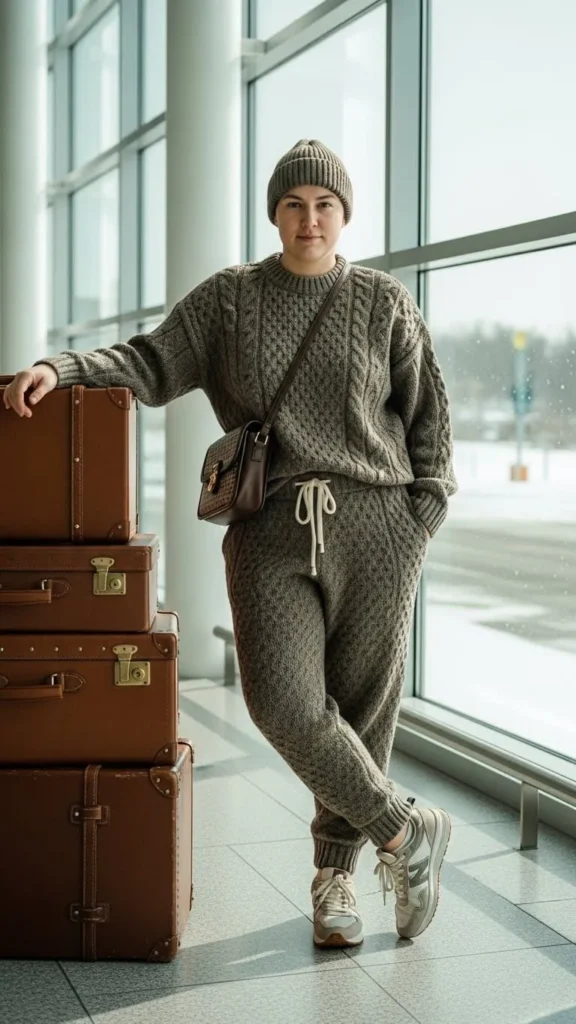A knit set feels soft and warm, perfect for long travel hours. Choose a matching top and bottom for a clean look. Add a long coat and trainers for comfort. If you’re saving money, mix two different knits in similar colours to create your own set. This outfit works well for flights and long car rides.