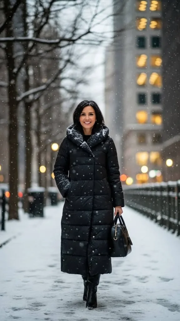 A puffy jacket is simple, warm, and easy to pack. Pick a mid-length style so it traps heat but doesn’t feel too bulky. Wear it with straight-leg jeans and a fitted knit top. Add a beanie for extra warmth. If you’re travelling light, compress the jacket into a packing cube to save space. Many budget-friendly stores offer puffy jackets in neutral colours that match everything. Choose waterproof shoes if you expect slush or puddles. This look is great for casual travel days when you’re moving between transport, hotels, and outdoor spaces.