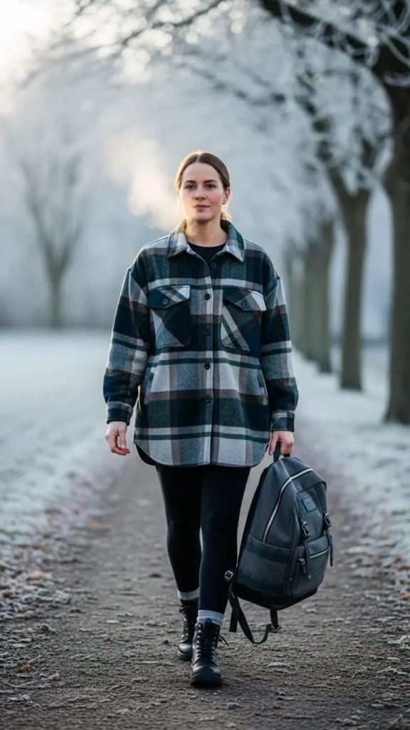 A plaid shacket adds warmth without bulk. Pair it with leggings and a fitted top for a cosy outfit. Add ankle boots or trainers depending on weather. Budget tip: layer a hoodie under your shacket for colder temperatures. This outfit works well for road trips and relaxed travel days.