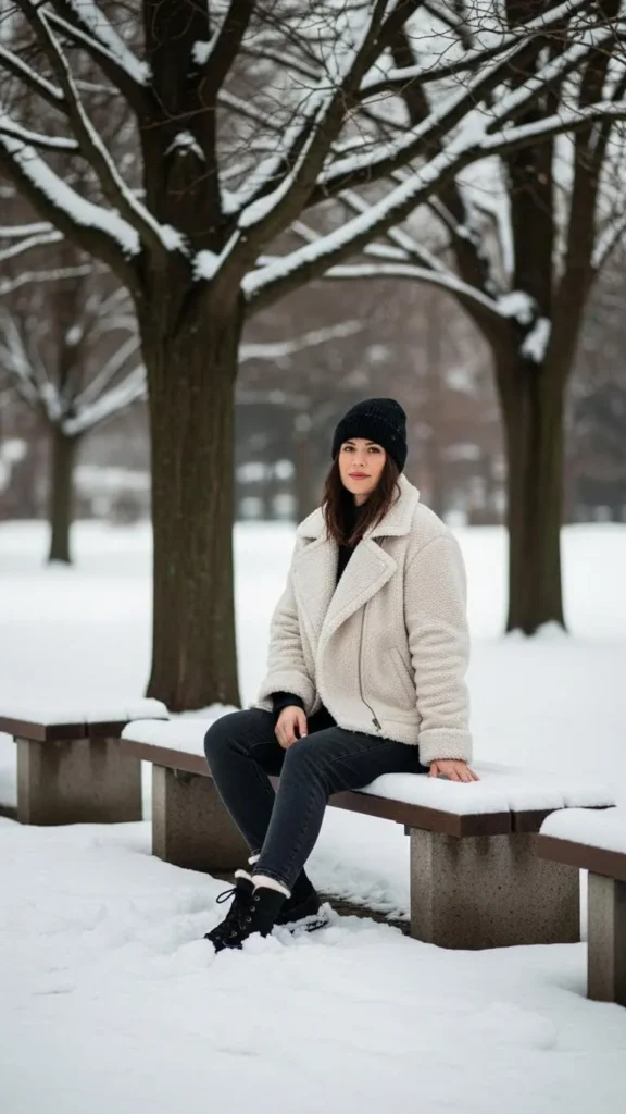 Sherpa jackets feel soft and warm while adding texture to your outfit. Pair one with jeans, a long-sleeve top, and warm socks. If you’re on a budget, look for sherpa-lined hoodies—they’re affordable and warm. This outfit suits mild winter trips and relaxed sightseeing days.