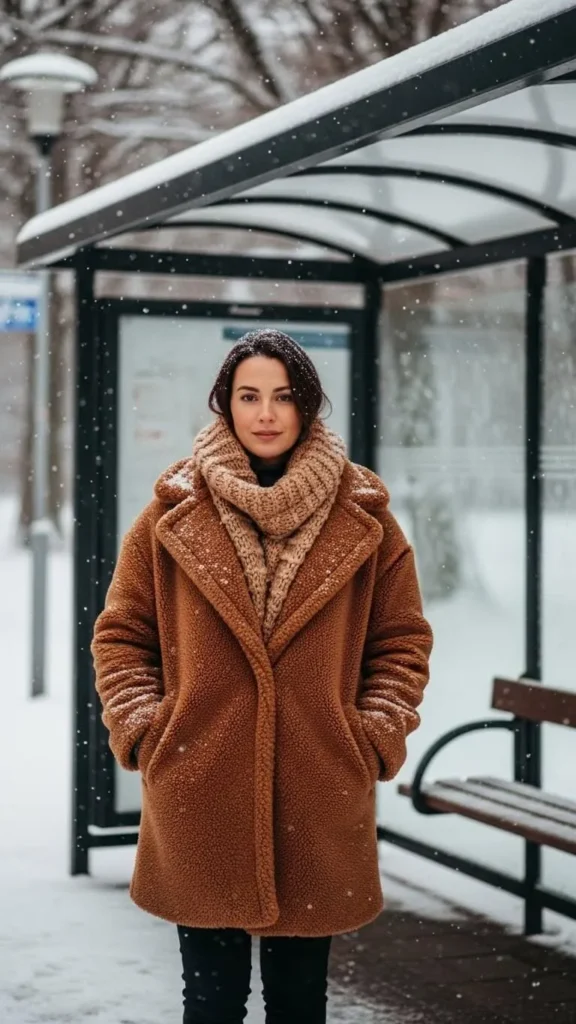 Teddy coats feel cosy and warm without heavy structure. Pair one with a fitted top and slim trousers to keep the look balanced. Add a scarf on extra cold days. If you’re saving money, look for teddy-style fleeces—they create a similar feel. This outfit works for relaxed travel days and street exploring.