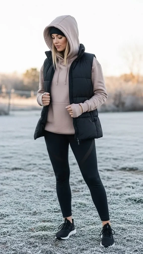 Athleisure works well when layered correctly. Start with leggings, add a warm hoodie, and then throw on a puffer vest. This keeps your core warm while giving your arms freedom. If you’re on a budget, reuse your workout gear and add a vest from discount stores. Wear trainers with warm socks. This outfit works for casual days and light hikes.