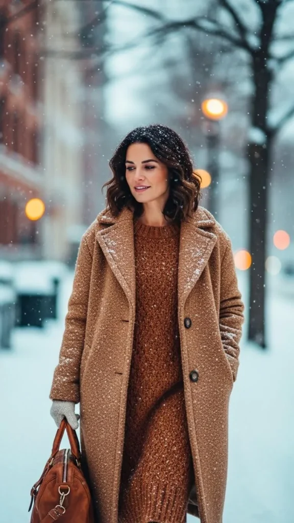 A knit dress offers warmth without bulk, which makes it perfect for winter travel days when you want to look stylish with minimal effort. Pair it with a long wool coat to keep out the cold. Add tights if temperatures drop lower. Knee-high boots protect your legs and give the outfit a clean shape. If you’re saving money, wear any sweater dress you already have and pair it with a thrifted belt to give it more shape. A simple crossbody bag works well since it keeps your hands free while walking through cold streets. This outfit suits city trips, holiday markets, and evenings out, giving you warmth from head to toe without complicated layering.