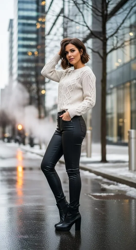 Faux leather pants are edgy but practical. They look amazing with cozy sweaters or long coats. You can find them at any price point. For comfort, choose the ones with stretchy lining. Pair them with sneakers for casual outings or heels for night looks. If you want something unique, DIY distressing or side zippers adds personality.