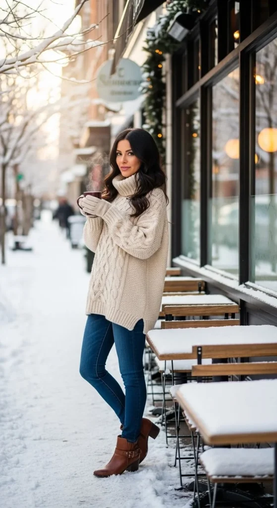 An oversized cable-knit sweater is the classic winter go-to. It’s warm, comfy, and goes with everything. Pair it with jeans and ankle boots for an easy everyday look. For a cute twist, tuck the front into your waistband. Try neutral colors like beige, oatmeal, or soft pink for that cozy vibe. If you’re on a budget, thrift stores often have chunky knits that look brand-new. Add a statement scarf to bring personality to your outfit.