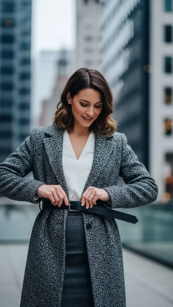 Adding a belt to your winter coat instantly shapes your outfit. It defines the waist and makes even simple pieces underneath look more styled. Choose a slim leather belt if you prefer subtle detail. If you’re saving money, reuse belts from older outfits—they look new when paired with heavy coats. Underneath, keep your look simple with a turtleneck and trousers. Add gloves in complementary tones for texture. If your coat feels oversized, the belt helps keep the silhouette controlled. This look works well for long commutes or walking through the city. It gives your everyday office basics a tidy feel without buying new pieces.
