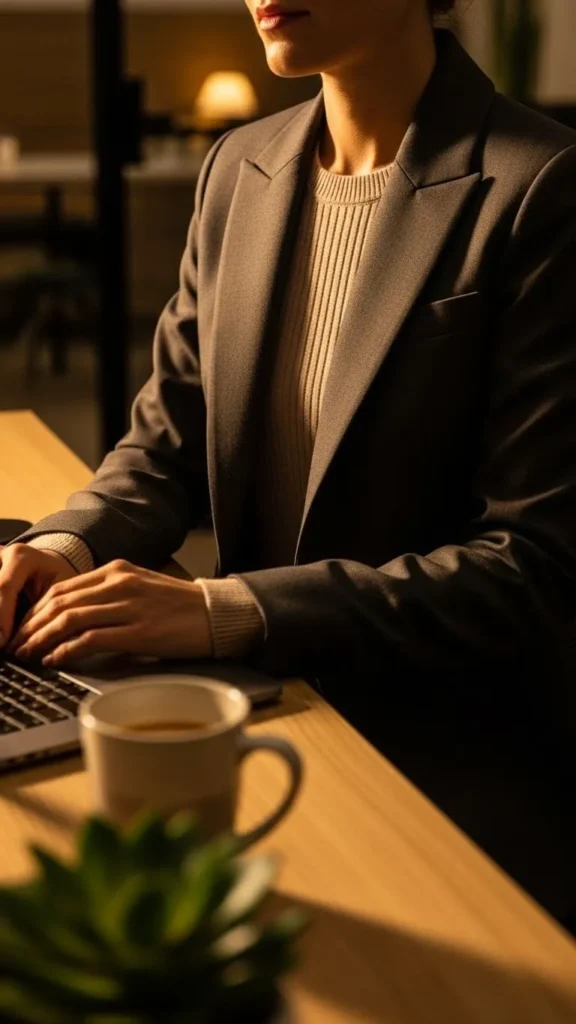 Layering a knit under a blazer keeps you warm while still looking sharp. Choose a blazer with enough room so the knit doesn’t bunch around the shoulders. A cashmere-blend sweater looks polished even in simple cuts. If you’re budget-minded, try a second-hand blazer—they often hold shape better than new fast-fashion versions. Pair with dark denim or tailored slacks depending on your workplace dress code. A simple gold or silver watch adds structure. If the weather is very cold, layer a thin base top under the knit. The trick is keeping lines clean so the outfit stays tidy. This look is ideal for meetings, hybrid workdays, or days you want to feel more put together.