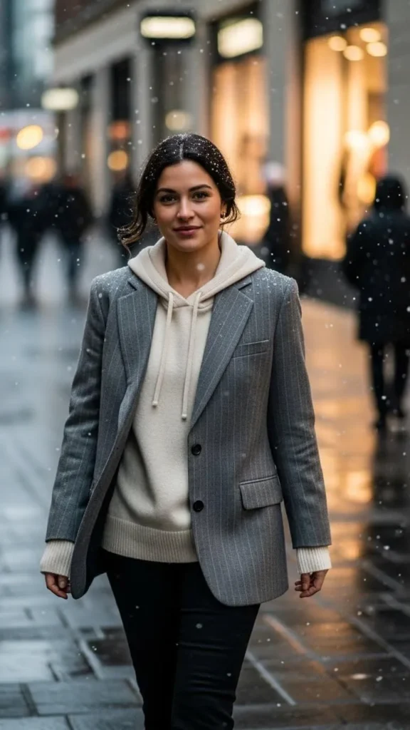 Pairing a hoodie with a blazer creates a relaxed office look that still feels tidy. Choose a thin cashmere-blend hoodie so the layers sit smoothly. Stick to neutral colours like grey, cream, or black. If you’re sticking to a budget, you can use any slim hoodie you already own—just choose a blazer with roomy shoulders. Add slim trousers or dark denim depending on office rules. This combo works well for casual offices, hybrid workdays, or commuting. Keep accessories simple so the layers stay the focus.