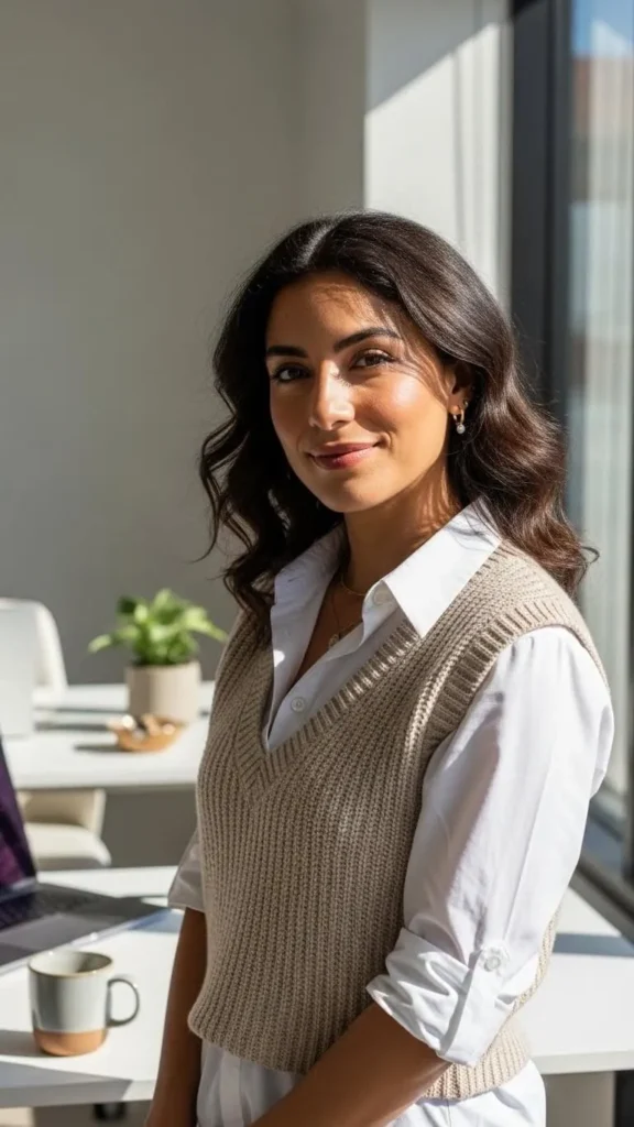 A collared shirt under a crewneck sweater always reads professional. Let the collar and cuffs peek out for structure. Choose a neutral sweater for easy mixing. If you’re watching your wallet, you can reuse older shirts—the sweater adds instant polish. Pair with trousers or skirts depending on your day. Add loafers or ankle boots. This look works well for cold mornings or offices with strict dress codes. You can layer a thin thermal under the shirt to stay warm.