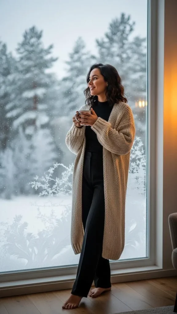 A long cardigan softens winter office outfits while keeping you warm. Keep the base outfit fitted so the cardigan doesn’t overwhelm your frame. Choose dark trousers and a simple top for clean lines. If you’re saving, thrift stores often have high-quality cardigans in wool blends. Add ankle boots to ground the outfit. If your office is chilly, this combo makes it easy to take layers on and off without disrupting your outfit. A slim necklace or hoop earrings are all you need for detail. It’s a relaxed but polished look ideal for everyday work.