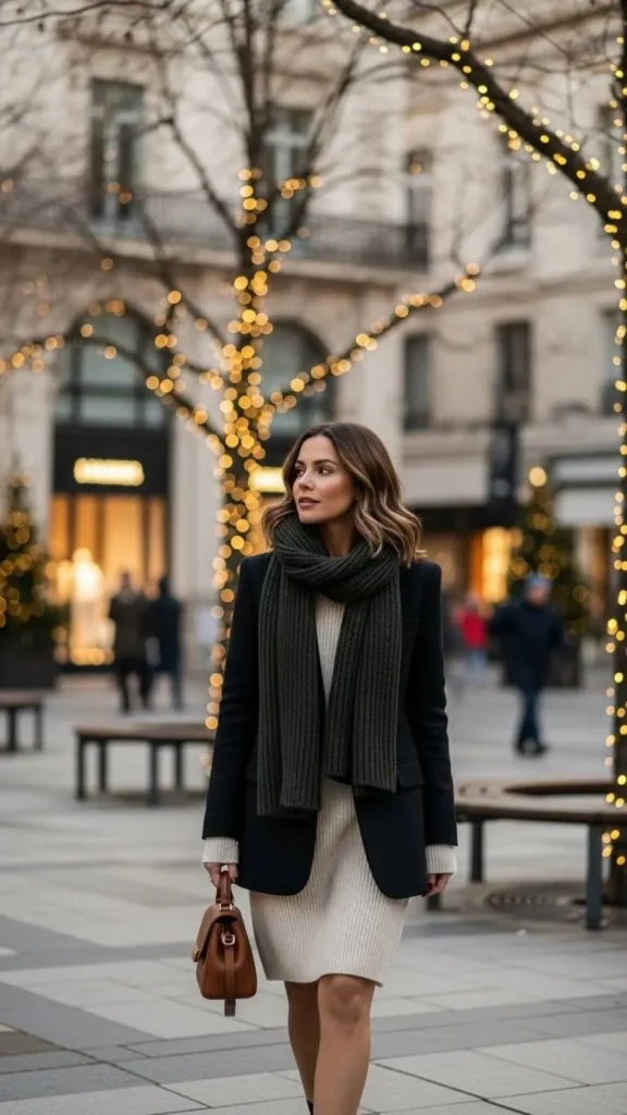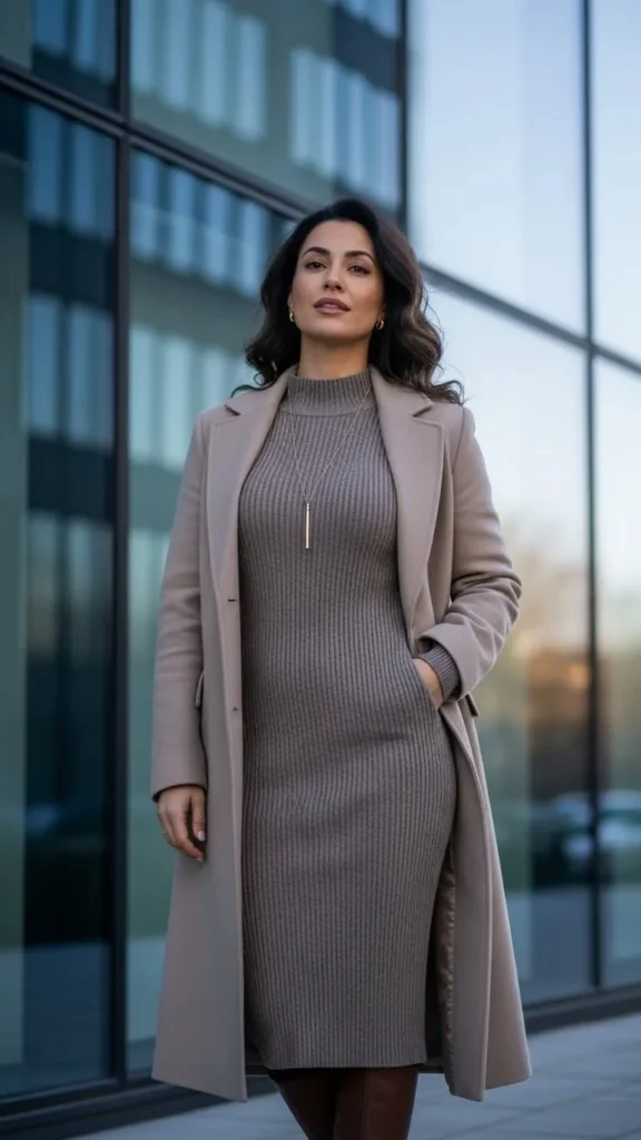 A knit dress brings comfort while still looking polished. Choose a midi length so the outfit sits well with tall boots or block heels. A longline coat adds structure and keeps the look balanced. Stick to monochrome tones to create smooth lines. If you’re watching your budget, choose a basic knit dress and pair it with a coat you already own. Add a thin waist belt to define shape. You can also layer a slip underneath for more warmth. A simple pendant or hoop earrings finish the outfit without feeling heavy. This look works well for office events or days when you want something easy but chic. It gives winter outfits a softer feel while staying practical.