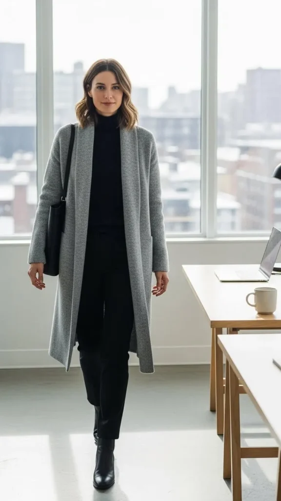 A coatigan is a soft, structured layer ideal for chilly offices. It falls somewhere between a cardigan and a coat. Pair it with slim pants so the outfit feels balanced. If you’re saving money, look for wool-blend coatigans—they usually keep shape well and cost less than full coats. Add a fitted top underneath to keep lines clean. A tote bag and ankle boots finish the outfit. This style works well for hybrid days when you want comfort without losing structure.