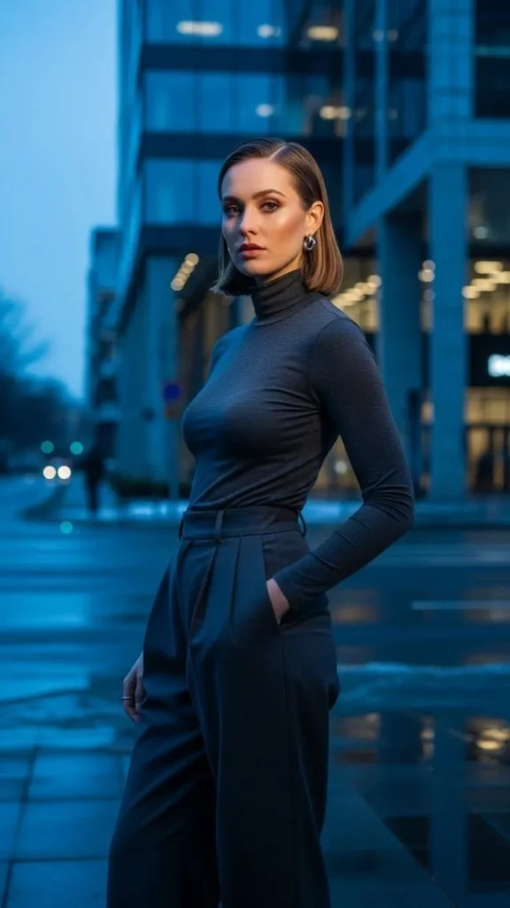 A knit turtleneck always feels tidy and pairs well with pleated trousers. Choose soft fabrics that hug the body without clinging. Pleated trousers add shape and keep the look sharp. If you’re on a budget, choose a basic turtleneck and mix it with trousers you already have. Add a belt for definition. A structured bag and simple hoops complete the outfit. This combo works well for offices that prefer clean lines. On colder days, layer a thin base top under the turtleneck.