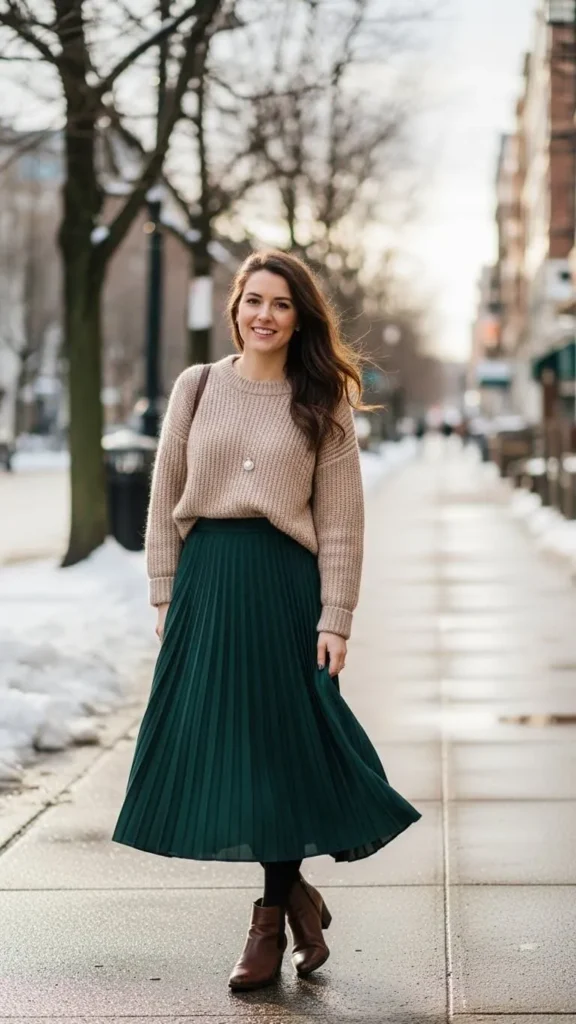 A slip skirt adds a soft sheen to winter outfits and pairs well with thick knits. Choose a matte-finish skirt for a more professional look. If you’re watching your budget, pick a basic knit sweater and match it with a neutral slip skirt for easy mixing. Add tights and ankle boots for warmth. Keep accessories small so the fabric textures stand out. This outfit works well on mild winter days or offices that allow relaxed styling.