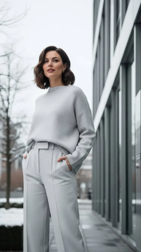A monochrome outfit instantly looks clean and put-together. Pick a shade like cream, grey, or deep brown for a winter-friendly finish. Pair matching trousers with a sweater in the same colour family. If you’re working with a tight budget, combine pieces you already own that fall within similar tones. The subtle match creates a polished effect without buying a full set. Add sleek ankle boots to keep the outfit grounded. A thin chain or stud earrings add just enough detail. When stepping outdoors, throw on a coat in a slightly deeper shade for contrast. This style works well for open offices or creative workplaces that prefer softer lines.