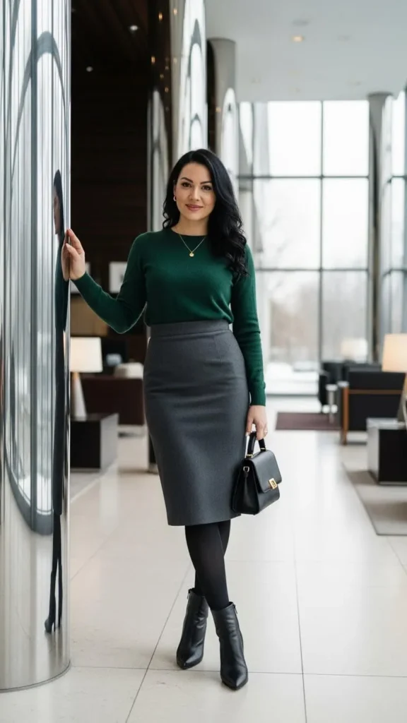 Pairing a slim sweater with a pencil skirt is an office classic. The fitted top balances the structure of the skirt, and tights keep you warm without breaking the silhouette. Choose opaque black or dark grey for a clean look. If you’re trying to save, reuse your autumn skirts and simply match them with thicker sweaters. You can layer a fitted thermal underneath the sweater on colder mornings. Add simple pumps or ankle boots depending on your office dress code. Keep accessories minimal so the lines of the outfit stay sharp. This look works for presentations or everyday office wear and transitions smoothly from desk to dinner. Stick to neutral tones for easy mixing all season.
