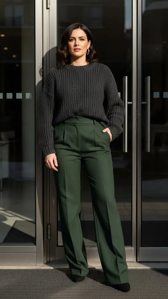 A structured sweater gives shape without needing a blazer. It works especially well with high-waisted trousers because it highlights the waistline. Choose trousers with clean tailoring and keep colour tones simple. If you’re watching your budget, pick knits with slight ribbing—they hold shape well and often cost less. Add loafers or ankle boots depending on your day. A tote bag finishes the outfit without adding clutter. You can also layer a fitted long-sleeve top under the sweater for warmth. This look works for everyday office wear, especially in workplaces that prefer quiet style. It’s an easy way to feel polished without layering too many pieces.