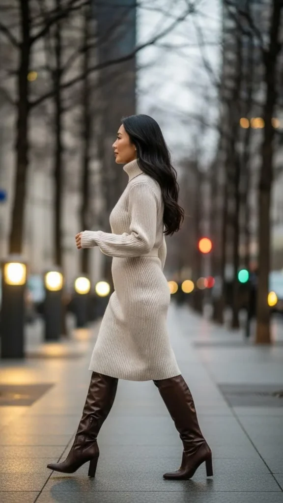 A sweater dress feels comfortable but still looks refined. Match it with knee-high boots for clean lines and winter warmth. Pick a midi length so the dress sits well with taller boots. If you’re on a budget, choose a basic sweater dress and upgrade the outfit with accessories you already own—a belt, scarf, or polished handbag. Layer a slip underneath for extra insulation. Keep colours simple so the boots stand out. This outfit works well for casual offices or days when you want an easy one-piece solution. Add a long coat for your commute and you’re set.
